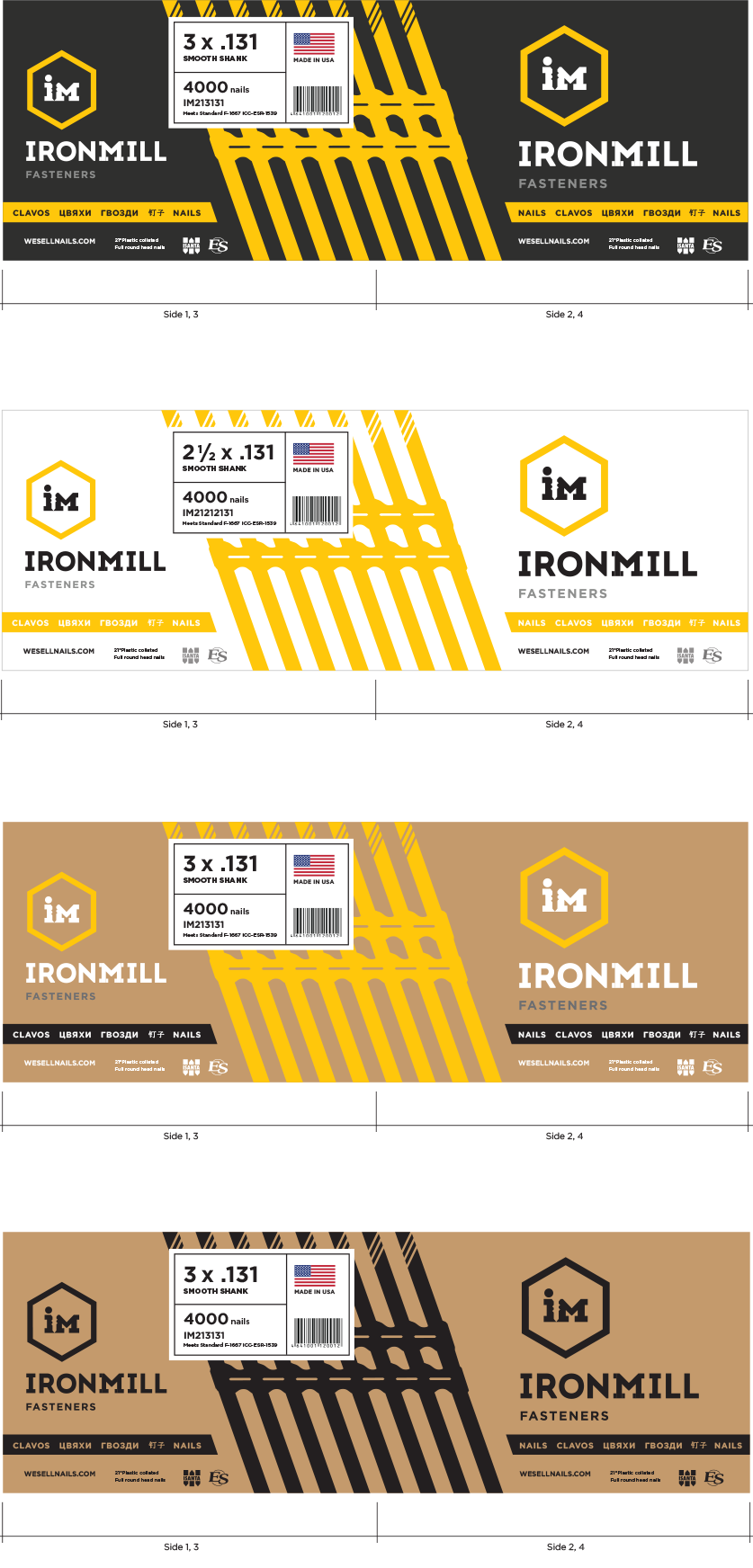 Одним из преимуществ Ironmill Fasteners является собственное производство, и в списке задач значилась разработка упаковки. На полке она должна была выгодно отличаться среди конкурентов, быть яркой и стильной. По просьбе клиента мы разработали несколько цветовых решений.